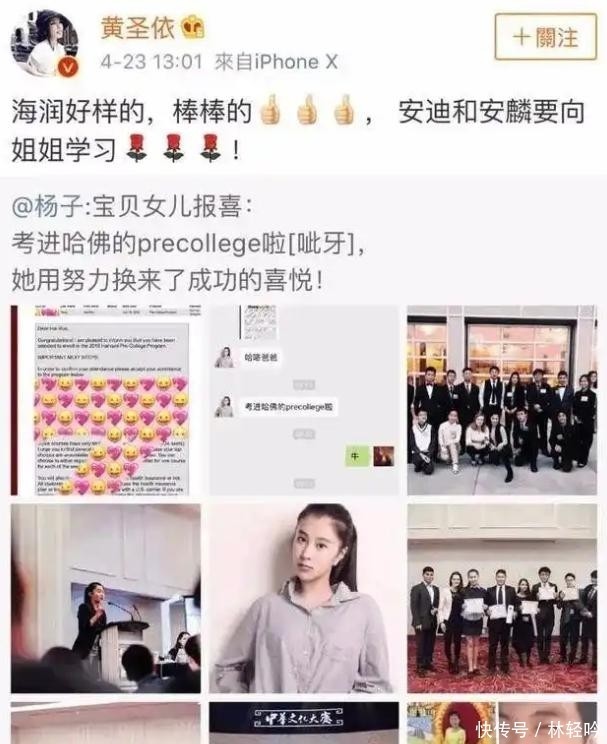 早年考入哈佛大学预科班时,黄圣依曾在社交平台转发杨子发文,鼓励两个儿子以姐姐为榜样。