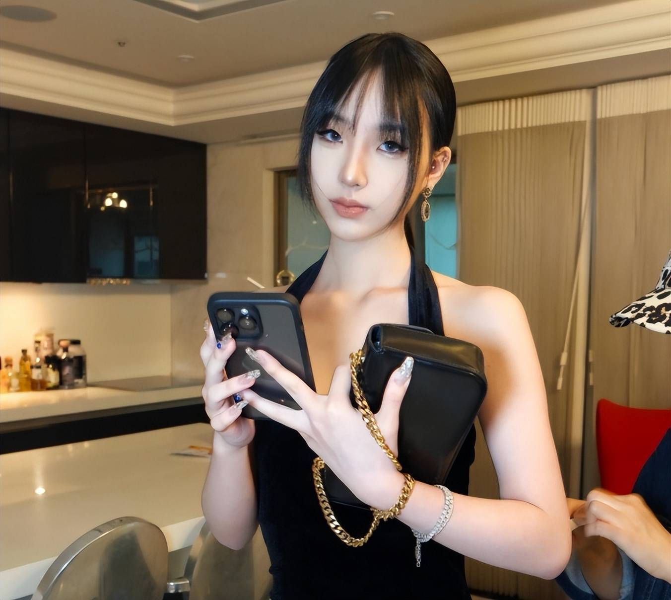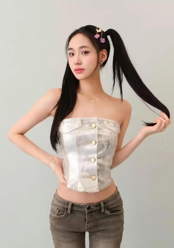 现在的她染了一头金发,养出了健康的小麦肤色,一身深色连体吊带裙,满是随性的ABC风格。吊带的设计刚好露出精致锁骨,裙摆长度适中,既展现了纤细的腰肢,又不会显得刻意卖弄。微微侧身的姿势让腰线和臀线形成完美曲线,四肢纤细却不干瘦,小麦色的皮肤和深色碰撞出满满的健康活力,活脱脱一个美式辣妹既视感。